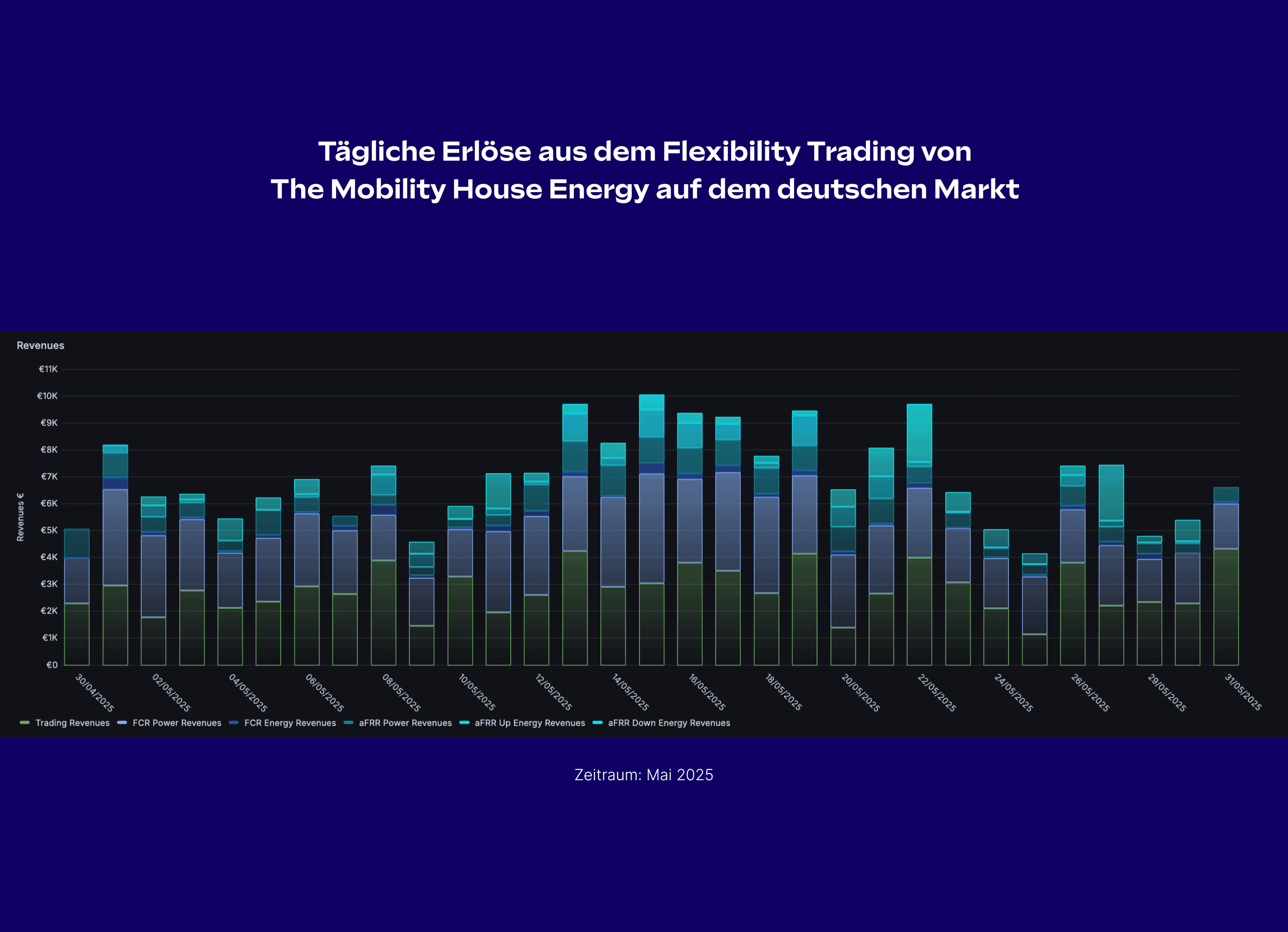 The Mobility House Energy vermarktet seit 2016 Stromflexibilität von großen Batteriespeichern an europäischen Energie- und Leistungsmärkten. Wir betreiben dafür einen eigenen Energiehandel und agiert als White-Label-Optimizer. Die Flexibilität der Speicher wird in sogenannte „Virtual Assets“ aufgeteilt und mithilfe eines Algorithmus (FlexibilityTrader) rund um die Uhr optimal am Markt eingesetzt.