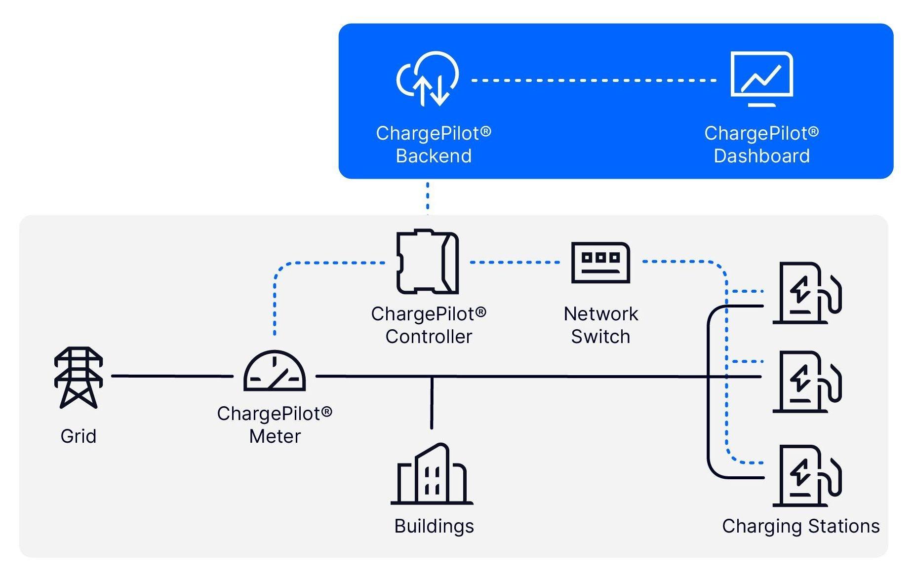 The ChargePilot® Controller is installed on site and houses the FlexibilityCharger technology. It establishes the data connection between charging points, grid connection and other consumers, such as a building, and controls the energy flows in real time. All data is sent to the cloud - the ChargePilot® backend. Access is simple and convenient via the ChargePilot® dashboard.