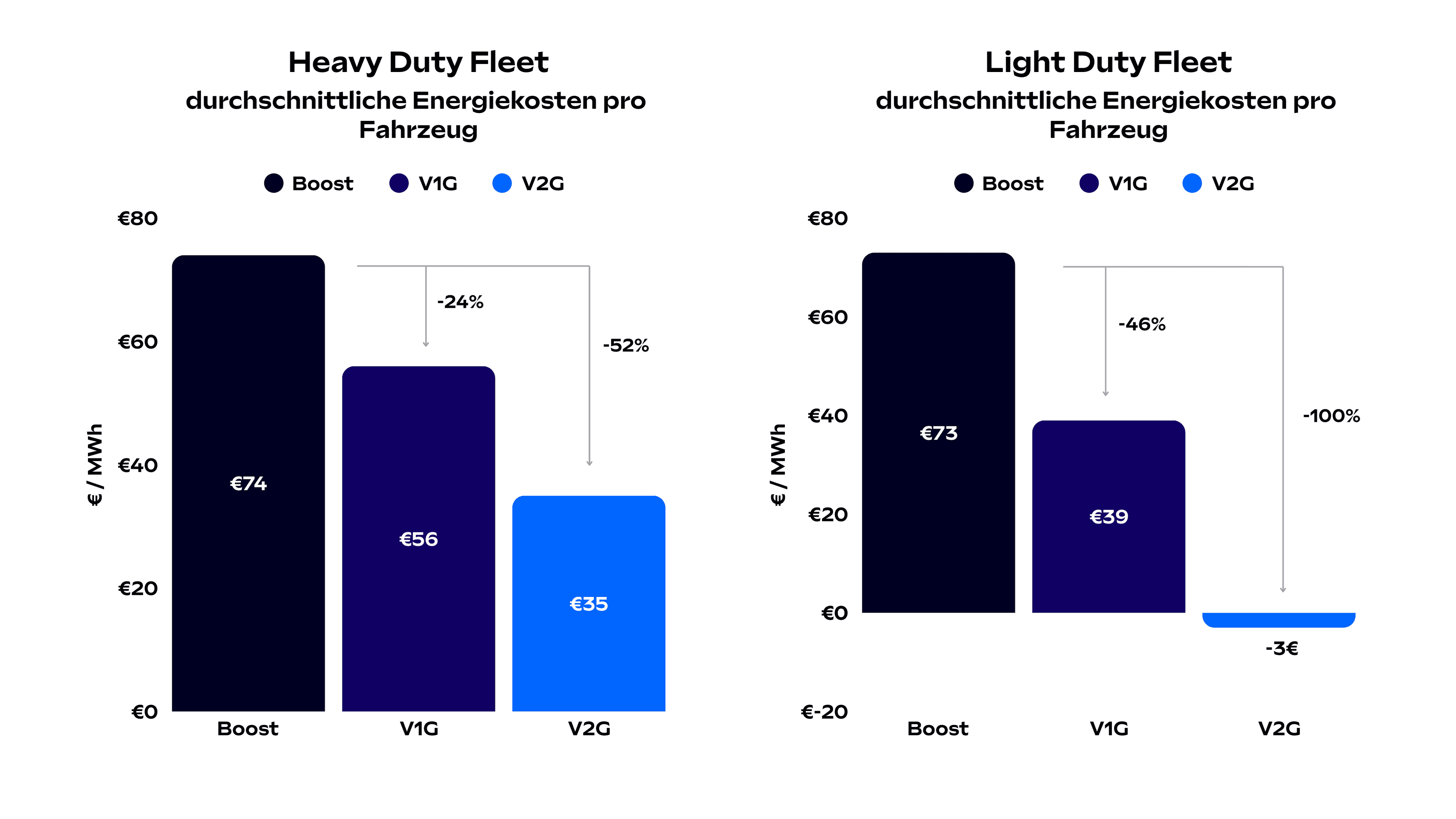 Mit V1G (Vehicle-to-Grid) passt unsere intelligente Technologie die Ladeleistung deiner Fahrzeuge in Echtzeit an die Netzbedingungen und Stromnachfrage an. Die Plattform sorgt dafür, dass das Laden deiner E-Fahrzeuge zu den günstigsten Zeiten erfolgt, basierend Echtzeit-Daten aus dem Strommarkt. Das bedeutet, dass du nicht nur Energiekosten minimierst, sondern auch deine Flotte effizienter und kostengünstiger betreibst. V1G maximiert die Energieeffizienz deiner Fahrzeuge, ohne dass du auf Flexibilität verzichten musst.