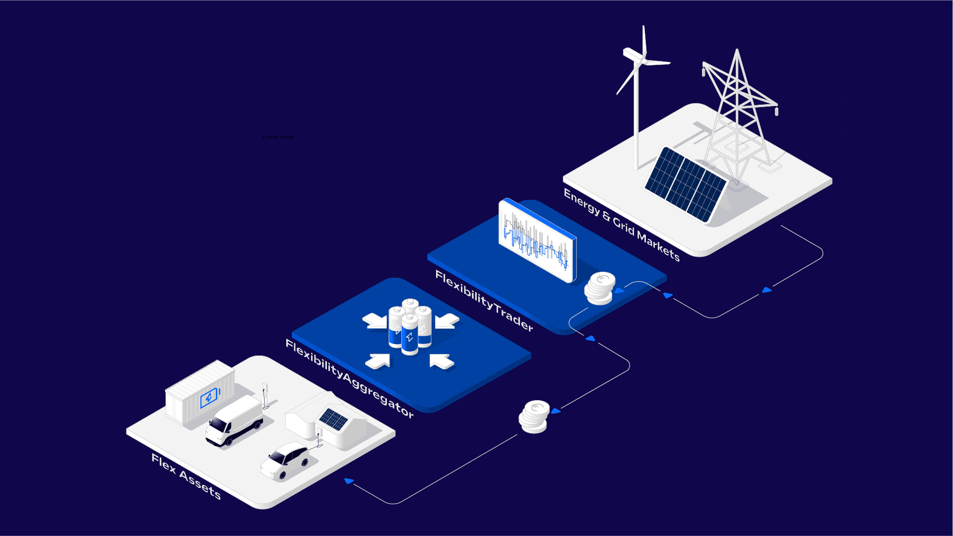 FlexibilityAggregator ist eine Plattform mit der wir dezentrale E-Autobatterien zu einem virtuellen Kraftwerk bündeln. Ob uni- oder bidirektional, angeschlossen werden können einzelne E-Fahrzeuge, die zuhause geladen werden, ebenso wie E-Fahrzeuge von Depotkunden. Dabei generiert FlexibilityAggregator optimierte Ladepläne, die auf den konfigurierten Handelsalgorithmen von FlexibilityTrader basieren.