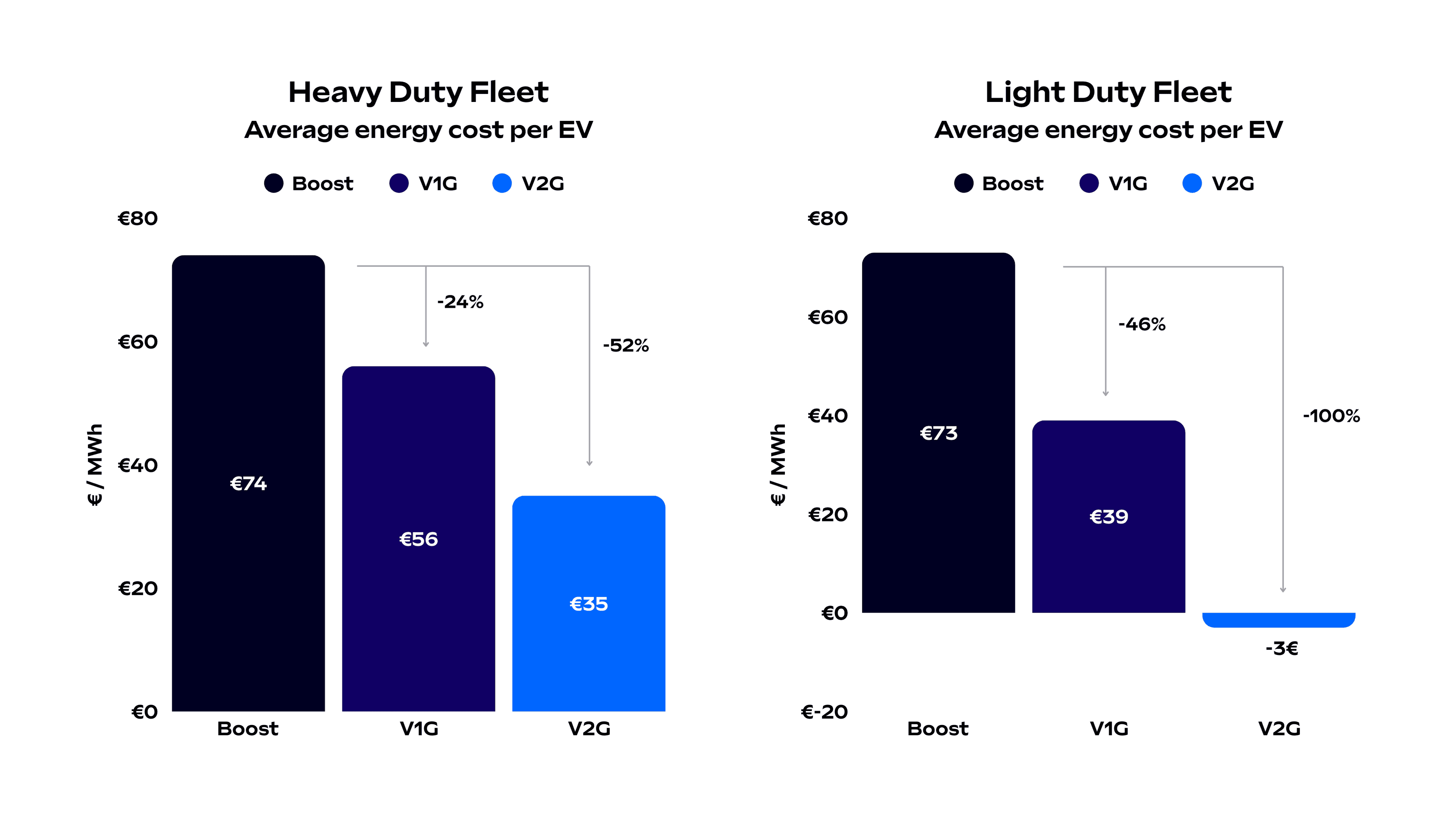 Market your EV fleet as a flexible energy storage solution, feeding excess solar and wind energy back into the grid when needed – supporting the integration of renewable energy and promoting grid stability.